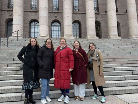 CP Danmarks deltagere ved CP Norden-konferencen i slutningen af 2025 foran det finske parlament. Fra venstre: Landsformand Pia Allerslev, socialfaglig rådgiver Line McMonagle, kursus- og projektansvarlig Stine Stenholt, bestyrelsesmedlem i CP UNG Maja Sommer og Julie Morell Jensen fra CP Danmarks Forretningsudvalg